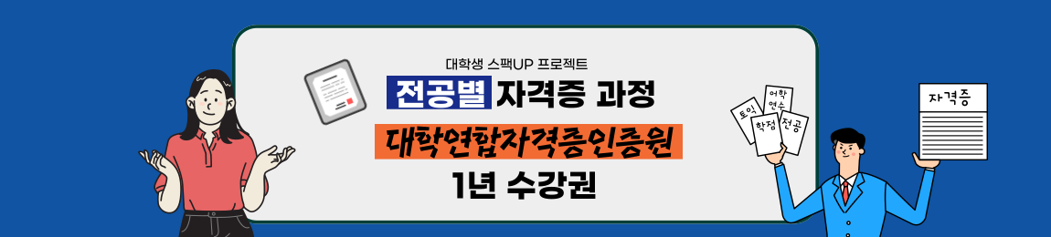 공학계열학부 컴퓨터계열학부 | 정보보안전문가1급, 해킹보안전문가1급 네트워크전문가1급, 빅데이터전문가1급 소프트웨어교육지도사1급 스마트IT컴퓨터지도사1급 스마트폰활용지도사1급, 코딩지도사1급 엑셀실무전문가1급, 전산세무1급 컴퓨터OA마스터1급 컴퓨터사무정보처리사1급, 품질검사마스터1급 | 공기업수리NCS 토익 컴퓨터활용능력2급 |